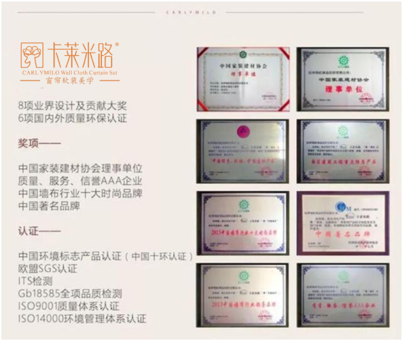 “卡莱米路”软装美学品牌是央视上榜“十大墙布时尚品牌”之一,2022年被中国家装建材协会评为“质量、服务、信誉AAA企业”、“国家建筑工程重点推荐产品”、“中国绿色、环保、节能产品”、家装建材“中国著名品牌”、“中国人民保险公司质量保证品牌”。