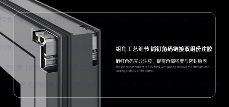 素派门窗采用销钉角码注胶连接,角码与型材缝隙间,注入德国WEISS韦思(原卫仕)双组份组角胶,型材端面滚刷防水胶,大幅提升提升角部结构强度,全方位严丝合缝,拼接密合不渗水,提高门窗防水性能。