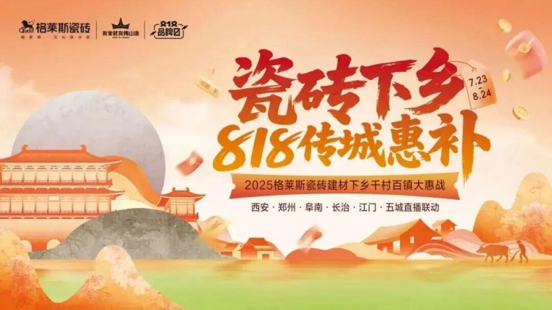 2025年,品牌推出“瓷砖下乡 818传城惠补”专项行动,针对下沉市场精准推出 “香云纱原生系列”、“莱姆石系列”与多规格子母砖等多组高适配性产品套餐及专属补贴,通过内容共创与门店陪跑,实现曝光4880万+、总互动量达23万+,订单完成率118%的卓越战绩。